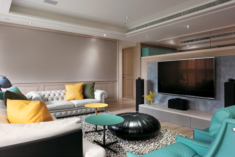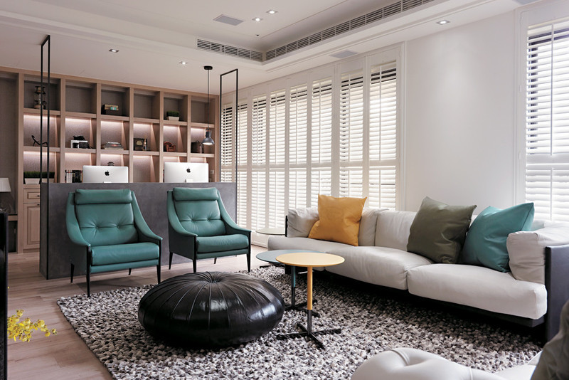 客廳內的家具軟件擺設,兩張味道不同的二、三人座精品沙發,搭配色彩鮮明的單椅、抱枕、圓几,厚軟的地毯上還綴上饒富趣味的Esedra,充分展現自由不設限的品味張力,而客廳一角的上網兼閱讀區,是針對重度電腦使用者的男、女主人精心打造,檯面兩側加作鐵件框直抵天頂,讓微量的工業風與背靠的輕古典書櫃,微妙撞擊出風格混搭的衝突趣味。
