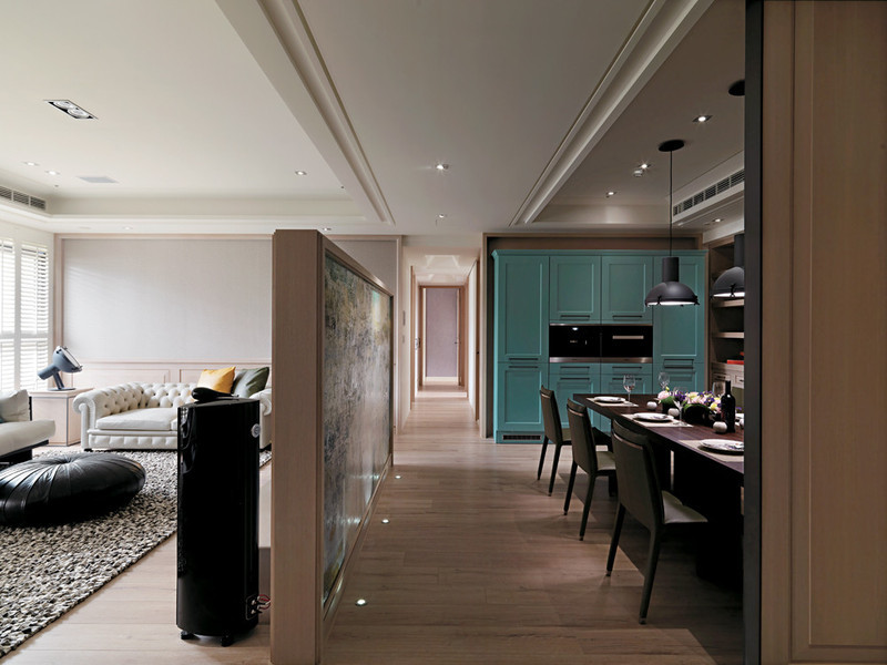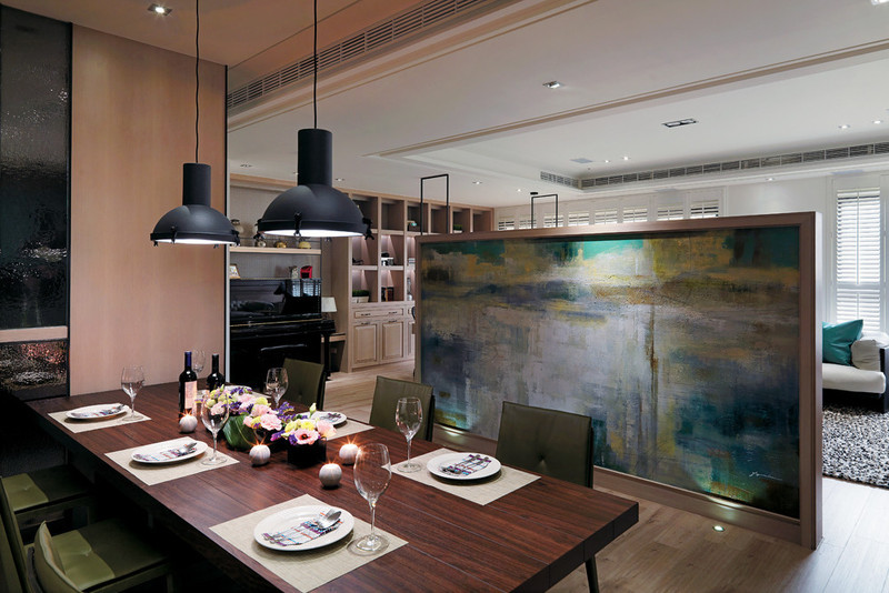 有時候創意與大膽必須劃上等號,才能求取最接近完美的答案。好比本案進門玄關與餐廳間的相對關係處理,突破了一般公式化的格局思考,放棄玄關的獨立分割,改以地磚拼花搭配造型屏風,象徵性劃分不同的區域屬性。