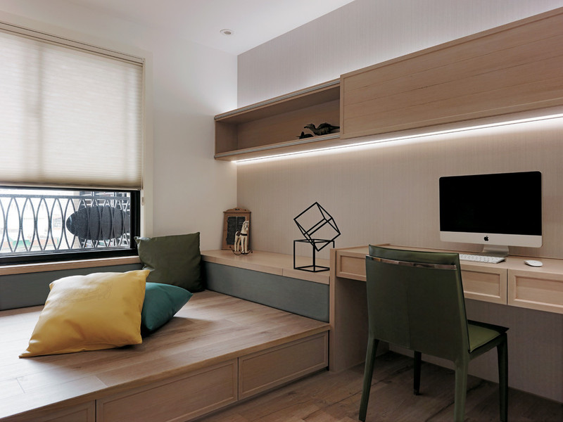 主臥室簡雅宜人,床頭牆面貼覆壁紙,會隨著光的角度閃耀低調光澤,兩側內退的木質溝槽嵌上經典壁燈,與屋主鍾愛的油燈收藏兩相呼應。三間小孩房各擁特色,並在有限空間內滿足必要的生活機能,靜謐的木色也讓空間增添情緒包容力,每個生活細節都滿是體貼與講究,而在這極度優渥的私領域裡,人們的肢體與心靈產生親密對話,由此產生的意識和感動,正是創造自我風格美學的重要源頭!