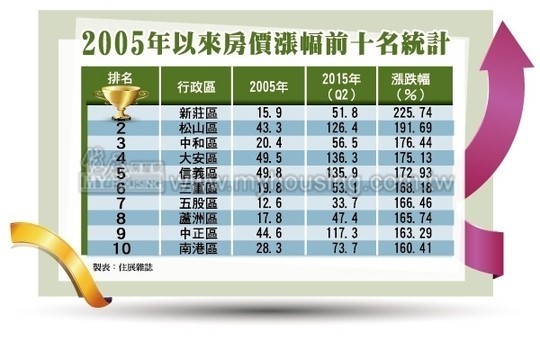 據住展雜誌統計,近十年來大台北各行政區新成屋、預售屋房價漲跌幅結果顯示,要擠進排行前十名,房價漲跌至少要一六○%以上。若買到前十名行政區房子的購屋族,身家至少翻漲一點六倍以上,根本是「坐地起富」啊!