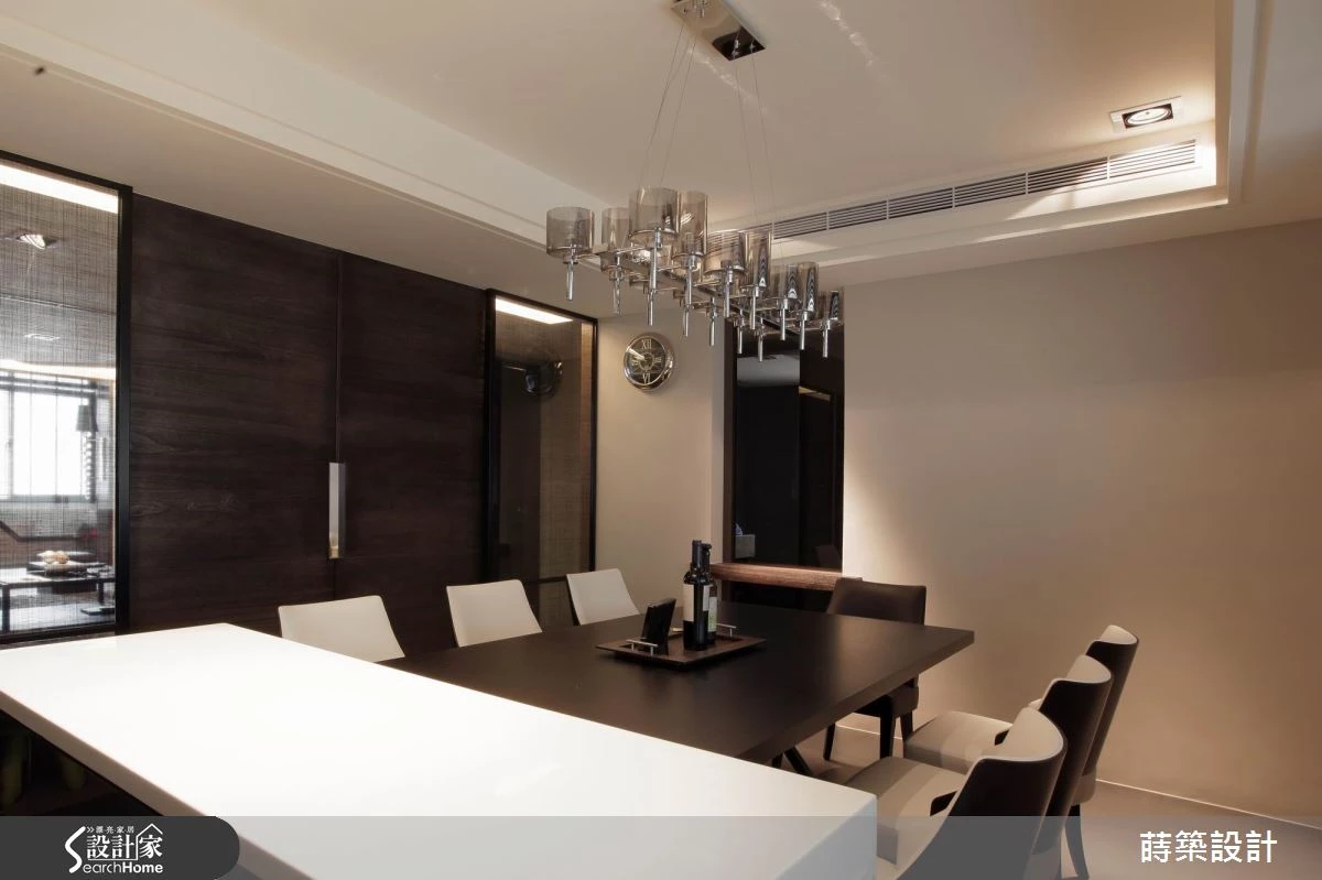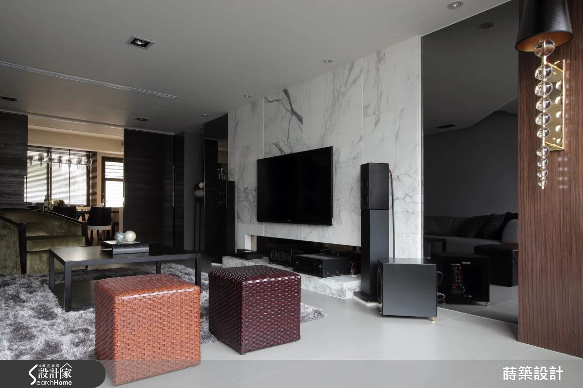 客廳在天花板加入律動線條,呈現宛如波浪起伏般的造型,替室內帶來生動朝氣,並採用灰階沙發背牆與沙發、地毯等,透過隨興的軟件布置,彰顯柔和的空間韻味,電視主牆則採以淺灰大理石打造,兩側拼接灰鏡材質,形成延伸通透的映照視野;並配置推拉門片界定餐廳與客廳,門片採以木質搭配茶鏡,讓場域彼此區隔但保有視覺串聯,並於餐桌上方懸吊精緻吊燈,匯集視覺焦點;臥房則做出較高的黑色繃布床頭,兩側妝點典雅床頭燈,賦予空間精緻優雅的品味,同時規劃更衣間,讓女主人享有專屬的梳妝天地!