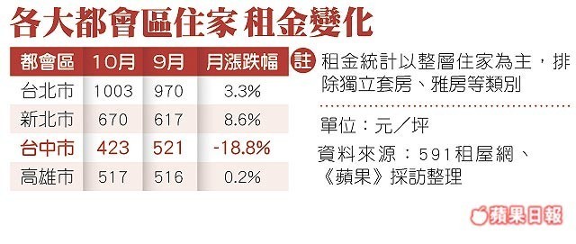 相較於大台北房租持續飆漲,台中租金卻下滑,觀察租屋網每月平均租金數據,雙北10月租金皆狂飆升達高點,北市每坪租金突破千元大關,但觀察台中市10月租金不漲反跌2成,每坪平均租金約423元,為北中南都會區最低。