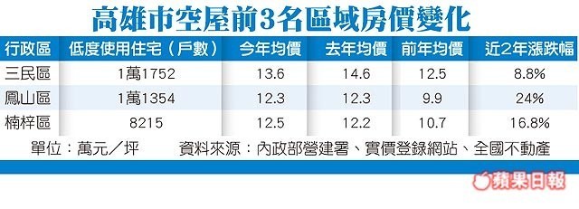 雖空屋多,房價仍上漲,統計近2年實價行情,三民區前年住宅均價每坪12.5萬元,去年漲至14.6萬元,今年下修至13.6萬元,漲幅近9%,而鳳山區更從前年每坪9.9萬元,漲至今年12.3萬元,漲24%,楠梓區也從10.7萬元漲至12.5萬元,漲幅17%。鳳山多為投資客