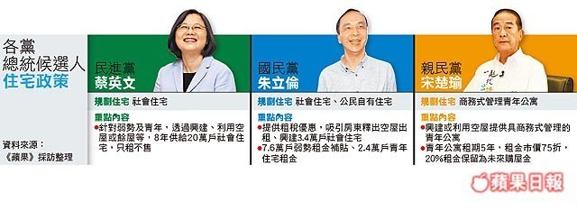 民進黨候選人蔡英文喊出8年內全國20萬棟社會住宅,國民黨候選人朱立倫主張提出租稅優惠,吸引房東釋出空屋出租,並提供租金補貼,親民黨候選人宋楚瑜則提出商務式管理青年公寓,規劃租期5年,租金則訂市價75折,且租金20%保留給承租人作為未來的購屋金。