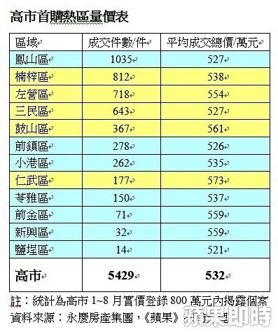 永慶房產集團統計今年1~8月實價登錄揭露,高市總價800萬元內首購宅,以鳳山1035件成交量最多,為首購最愛移居行政區;但排名2~5名分別是楠梓、左營、三民與鼓山區均屬北高雄。北高雄建物移轉件數共2723戶,較南高雄1842戶多881戶,居住人口北移明顯。