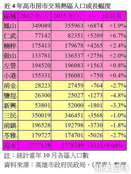 北高雄成為首購移居熱區,但高市過去4年人口僅增加1121人,台慶不動產南區發言人陸志宏指出,包括農16、美術館、高鐵商圈、高雄大學特區等新興重劃區商業機能成熟,具磁吸效應,人口增加行政區如鼓山、楠梓或仁武也是房仲一線戰區,「南高人口成長僅鳳山與小港,前者主要在於區段有包括華鳳、文山、鳳青等首購型大樓大量推案,後者民眾多選購88快速道路生活圈!」