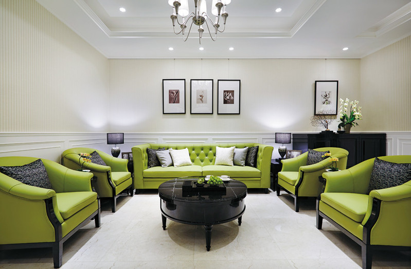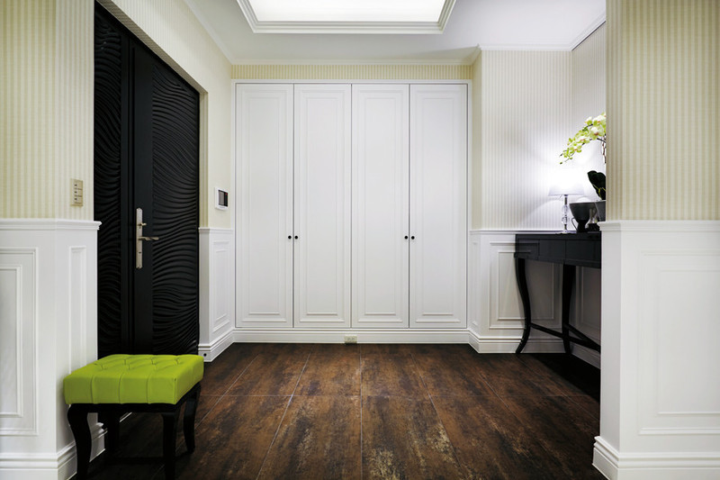 為了凸顯大器與尊貴,規劃出開闊而寬敞的玄關區域,透過金屬磚的拼貼紋理,與室內地坪產生內外分野,開放卻又各自獨立的區域屬性,符合屋主的優質生活品味。客廳區域利用線條的堆疊、間接光源,圍塑出天花具典雅的經典語彙,具豐富層次,卻不覺繁複,高雅而俐落有型;家具與燈具規劃上,採客製化的訂製手工設計處理,專屬而唯一,立面選用日本進口壁紙,紋理語彙清淺而雅緻,與綠色基調的訂製沙發組,相互映襯出空間的視覺焦點,且挹注絕對高雅、奢華的深厚且悠遠的古典寓意。