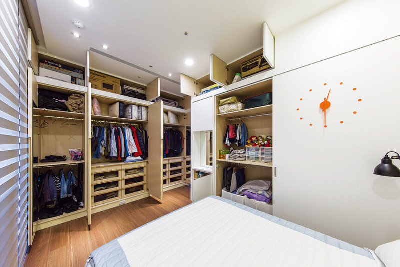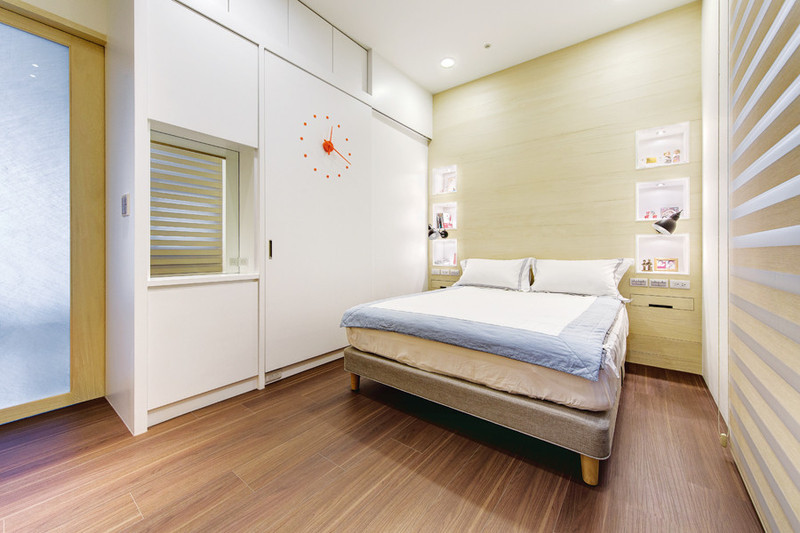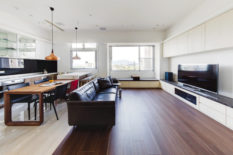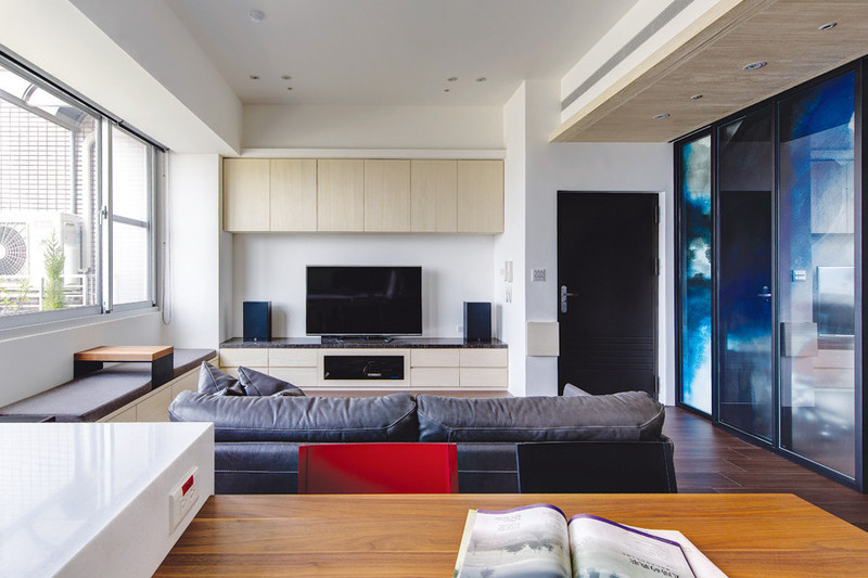 充足、好用兼顧美感的分區收納,絕對是一個空間常保清爽舒適的必要條件,而設計者在這方面的用心深受屋主讚賞,包括門邊不落地的置物檯巧思,讓愛乾淨的屋主第一時間就能完成物品歸類,接著善用客廳電視牆樑下、窗邊等區塊,分設造型櫃與坐榻收納,避免多餘的量體壓縮空間,餐廚區除了一字排開的實用上下櫃外,與餐桌銜接的特製中島也提供家電櫃機能,甚至連客浴入口上方、側邊的畸零地帶都沒有浪費!此外,設計師還利用書房的部份空間規劃一間儲藏室,儘管只有半坪大小,實用性卻令人喜出望外,內建如此大容量且多樣化的收納設計,現場卻絲毫沒有櫃體肆虐的痕跡,這才是真正從生活、品味、情趣發想的好創意!