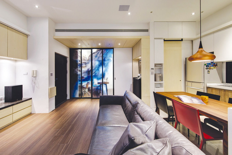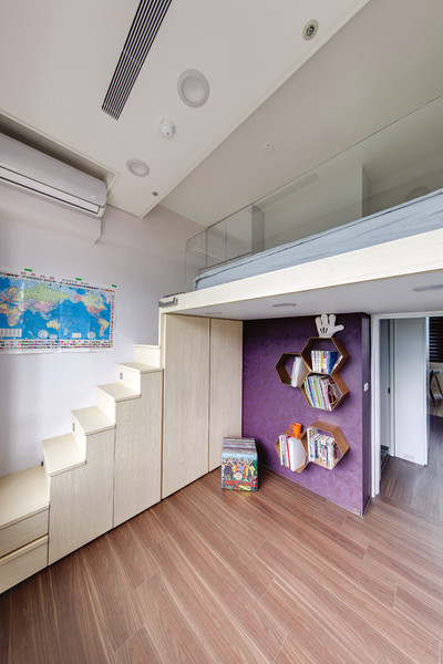 零浪費的平面配置,是這僅僅26坪的空間,看起來卻像是40坪的重要關鍵,首先是公領域的開放規劃,避免造型堆疊的簡潔天花板,除了整合全熱交換器、空調、燈光、音響等機能,也強化屋高三米六的先天優勢,客廳、餐廚間則利用地材差異、活動家具、銅金吊燈等元素,輔助劃分空間屬性與層次,與客廳比鄰的多功能書房,實際上兼具公私領域的動線轉換、緩衝意義,設計師特地邀請相熟的畫家揮灑現代潑墨創作,然後將寫意又夢幻的圖案轉印在書房拉門上,既能維持適度隱私與光影自由流動,更造就此案美侖美奐的空間亮點!更棒的是這扇拉門同時也兼作書房隔間,配合精算尺寸的兩用白色書櫃門,打造完整的書房介質,當有客來訪時也不怕影響孩子用功,平時更是熱衷閱讀、感情超好的一家人,最喜愛停留的親子互動場域。