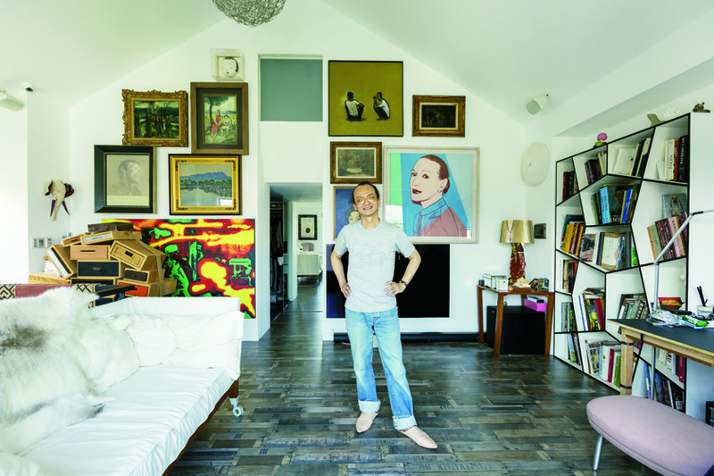 姚謙獨特的藝術鑑賞能力,從一樓推開大門的瞬間便可感受到,鑲嵌在牆壁裡的立體鹿頭藝品,是由日本藝術家名和晃平所設計,藉由折射效果,不同角度觀看能產生特殊的視覺效果,諷刺現代傳媒僅依自身立場隨意放大事件的現象。餐廳牆面掛著台灣閨秀女畫家陳進的作品,細膩而輕柔的女性特質,為現代感強烈的用餐空間增添柔美色彩,姚謙也特別喜歡此空間。「以前我都在三樓書房工作,但夏天太曬又太刺眼,最近喜歡待在一樓用餐空間,旁邊有自然植栽、通風良好,加上離冰箱很近,想吃什麼就拿什麼!(大笑)」畫作拼滿牆面,遠近各有不同含意