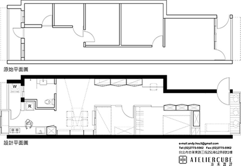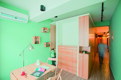 40年的老房子,為長輩傳承給下一代年輕夫妻使用,兩人都是SOHO族,必須長時間在家工作,也希望能預留小孩房的空間,然而回歸到現實層面,傳統長形街屋室內坪數只有20坪,狹長格局之下,寬僅3公尺,走道非常狹窄,中段兩間臥房也無法開窗,導致十分陰暗。如何透過配置手法,提升使用坪效,又要解決光線的問題,徐忠瑋設計師做了一個很大的調整,將格局左右對調,走道與房間位置互換,且臥房縮至最低尺度,放寬走道空間,一進門視線就能穿透至底端,感覺更形開闊舒適。更厲害的是,他善用老公寓梯間結構創造出開放式書房,就成了夫妻倆的工作閱讀區。無可避免的房間採光狀況,則於主臥房與餐廳隔間局部搭配清玻璃材質,加上隔間櫃體刻意不及頂、小孩房開窗等設計手法,層層引光提升舒適性,特別是主臥房,即使白天再也無須開燈。