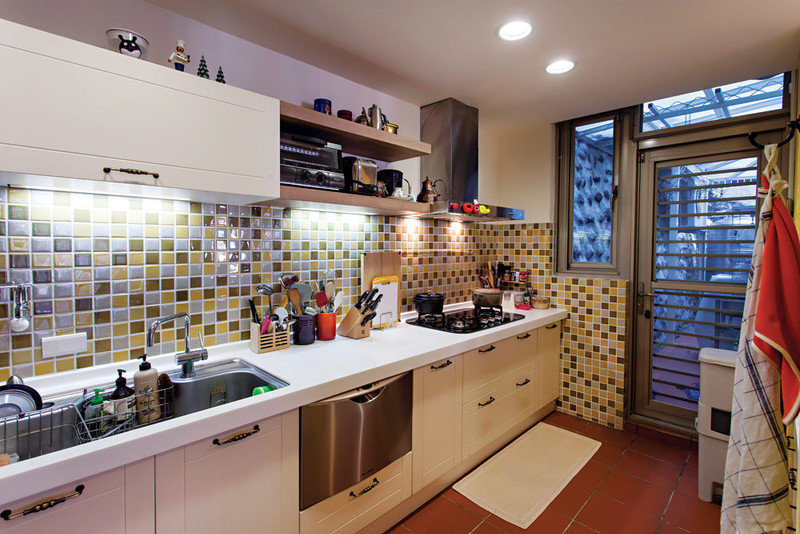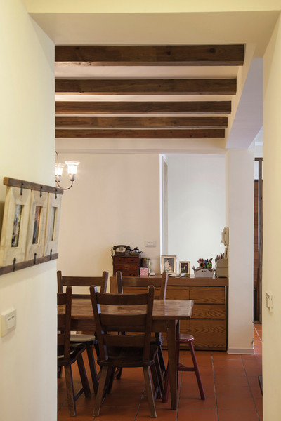 為了營造鄉村風格的生活情境,古鎮榮的太太特別從各地家具家飾店選購不同的生活物件,甚至當初設計師提供的拉門把手不符鄉村風格,她還特別親自到不同的五金零件行自己選購搭配,精確掌握落實每一個細節的要求和完整度;一進門的玄關地板上以活潑的拚花磚展現回家迎賓的趣味,客廳地板材質選用具有夏涼、冬防潮且耐刮磨的尺二磚,而到了主臥則轉換成緬甸進口的實心柚木,同時玄關門的臨窗休憩座位區,以柚木窗框勾勒出渡假生活的優閒鄉村樸質感,每一個細節都可看出古鎮榮夫婦對於居家細節的重視和追求究極的完美態度。