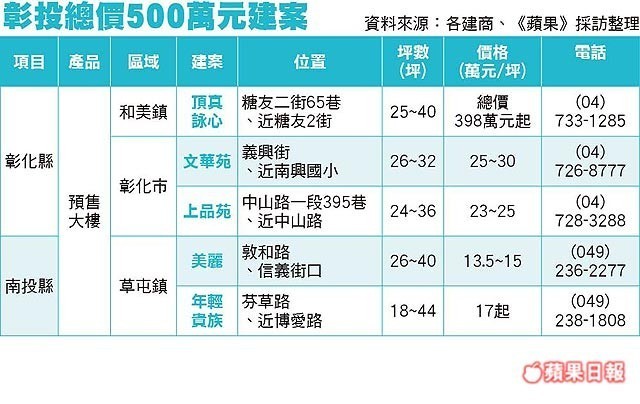 因台中市房地價高居不下,部分建商也退居至距離台中車程僅20~30分鐘的彰化、南投購地推案,近年2地大樓如雨後春筍般冒出,主力格局2~3房,總價500萬元即可一圓成家夢。
