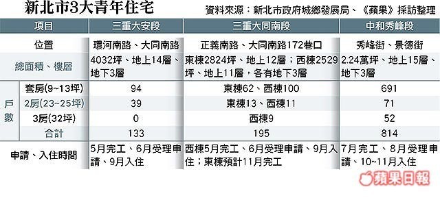 明年青年住宅進度,新北市城鄉發展局局長邱敬斌指出,三峽台北大學安置住宅26戶、40坪產品,預計今年12月完工,明年4月公告申請,36戶永和區秀朗派出所青年宅明年2月完工、6月開放申請,8月入住,新莊大豐76戶預計明年6月完工、7月招租,板橋府中72戶預計12月完工,2018年4月招租,估2019年可達成7000戶目標。資料來源:新北市政府城鄉發展局、《蘋果》採訪整理