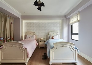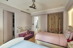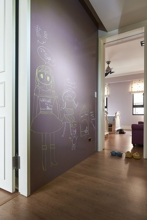 三樓斗大的粉紫色立面塗鴉,則明白表示出「歡迎來到小朋友的專屬空間」。進入有如童話故事中才會出現的孩童臥房,不禁激起心中的童心,更羨慕起精心規畫的室內空間。以兩張美國代理進口的藍粉床組為主角,床頭的ㄇ字型線版內也貼上饒富童趣的繽紛壁紙,在兩側簾幕的圍繞下,又增添幾許活潑氣息。而鮮豔奪目的紫紅色沙發也擺上許多小女孩的珍藏娃娃,讓珍貴的童年能在溫馨夢幻的環境中,和朋友構築專屬的兒時幻想。