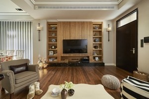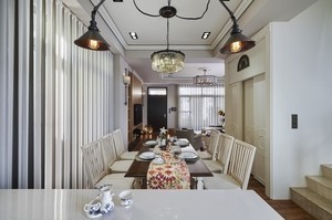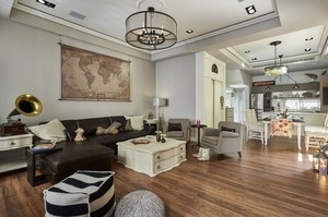 走進客廳,迎面而來的錯置時空感,便揭示設計師「以家具串連家人情感」的理念堅持,不成套的沙發搭配各具特色的古典家具,以及沙發後吊掛的世界地圖,傳達出質樸動人的美式居家情調;而較有現代感的灰白色調立面,則以溫潤的木質電視牆,和蘊涵中國歷代風韻的瓷器藝術,表現出屋主包羅萬象的美學品味。