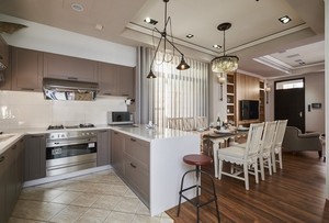 開放式的客餐廳與廚房,全室則運用美式進口家具和義大利進口樺品廚具,並加入古典的燈飾和電梯指針,將摩登復古的設計元素,融匯為別有異國風情的用餐空間。在場域分界上,設計師也以現代裝潢常用的中島廚具和地面材質,區隔出明確的空間定位。