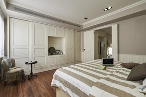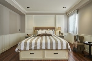 步上典雅的樓梯踏階來到二樓主臥,便可發現同樣以木地板傳頌的溫暖氣氛,搭配美式當代的簡約配色,不僅和室內主調配合得恰到好處;隱藏在立面的衣櫃櫃體和門片,也讓大宅的寬闊氣派感突顯得格外出色。而為呈現原汁原味的美國當代風,設計師也按色卡調配出漆色和白色腰板,搭配線條俐落的床頭,將主臥的紐約當代風塑造得更為完整。