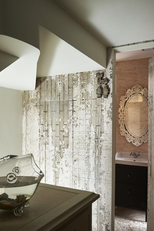 由於餐廳位於一樓的動線軸心,因此設計師除了將行進通道妥適規畫,也利用不同燈具折射出的光影變化,讓來自三面的光源,營造出特殊的空間氛圍。而隱身在仿舊壁紙的立面後方,則設置了通往客衛浴門片,並在門片旁貼心地加入造型指示牌,使來訪的賓客能從這些生活細節中,獲得出奇不意的趣味感受。