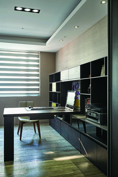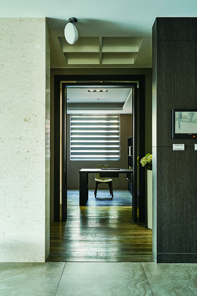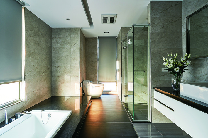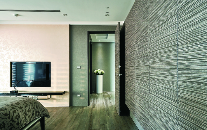 機能完善的主臥室座落客廳主牆後方,進入專屬小玄關後,直行可至書房,左轉才是更私密的主臥區域,透過動線轉折以連貫機能,生活的諸般情趣也隨之而來。睡眠區內一派清雅,房門後方安排長列衣櫃,沿著衣櫃直行前往梳妝區、更衣間和奢華浴間,浴室內賞景浴缸採低檯度的降板設計,地面依不同需求使用數種地磚鋪設,優渥的起居質感不言而喻。