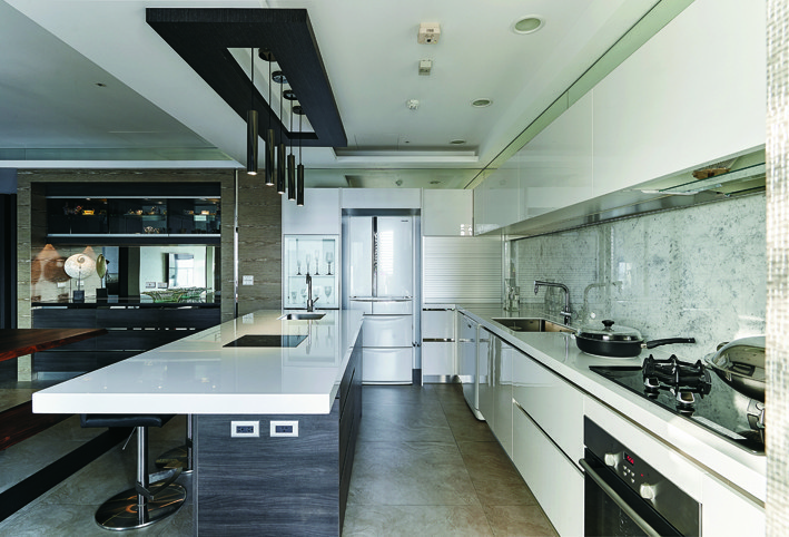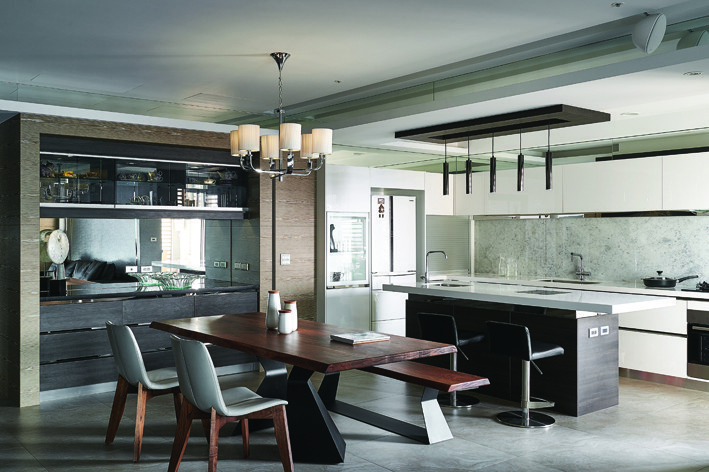 順著主動線的導引,進入開放規劃的餐廚區,設計師以平行的長餐桌、中島餐檯,打造洋溢休閒感的享樂聚落,用餐區搭配長凳、單椅與中島旁高腳椅的組合,就算多人聚會同樣遊刃有餘,餐桌旁黑梣木餐櫃呼應邊框的山形秋香,深淺躍動加諸天然紋理的跳色變化,也接著應用公領域四角、書房入口、陽台窗框等處的細節處理,彰顯設計師高度的美學涵養與精湛工藝。