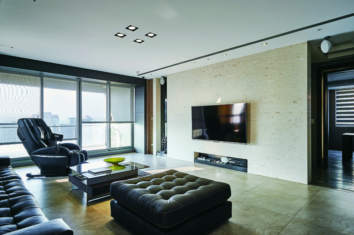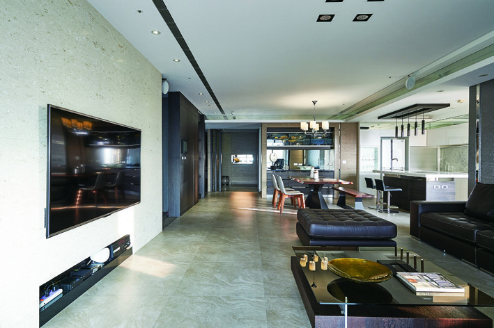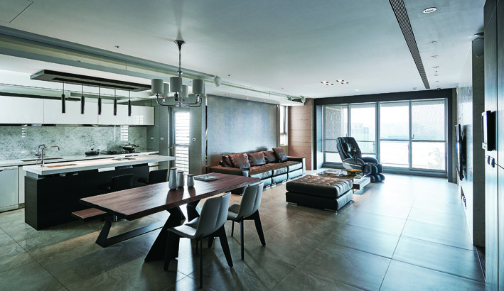 進門玄關區避免過度修飾,除了門後的木質高櫃,心思縝密的設計師另在玄關旁備有一座隱密的衣帽間,滿足大型生活物件與備品雜項的收納。腳步移入軒敞的公共空間,地面滿鋪流沙灰地磚,與玄關迎賓區域形成明確區隔,近似崗石的敦厚紋理,帶出客、餐、廚三者環環相扣的大器景深,也為簡潔俐落的休閒主題奠定基礎輪廓。