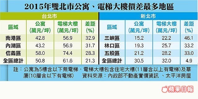 入主台北市,若口袋不夠深,除了「挑舊避挑新」,專家建議還是得從公寓產品著眼。太平洋房屋分析台北市電梯大樓與公寓的價差發現,電梯大樓平均價格高出公寓約2成,其中,像是南港、內湖區,價差更達3成以上。