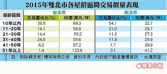 在0206震災過後,老屋耐震力成為民眾最關心的議題,房仲業者分析去年實價登錄數字發現,寸土寸金的台北市,屋齡10年以內的購屋比近4成,為最大宗;其中以屋齡31~40年的物件,均價最低,台北市電梯大樓與公寓價差至少2成來看,小資族想在台北市圓成家夢,只得屈就高屋齡公寓。
