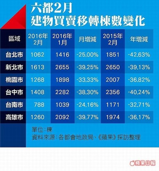由於2月適逢農曆春節,六都房市買氣飄雪,高雄、新北及台中市移轉棟數皆跌破2000棟,月減近4成,高雄市2月交易1260棟,與1月2092棟相比,買氣大減39.77%,月衰退最多,新北市僅交易1613棟,相較1月2655棟,也衰退39.25%。