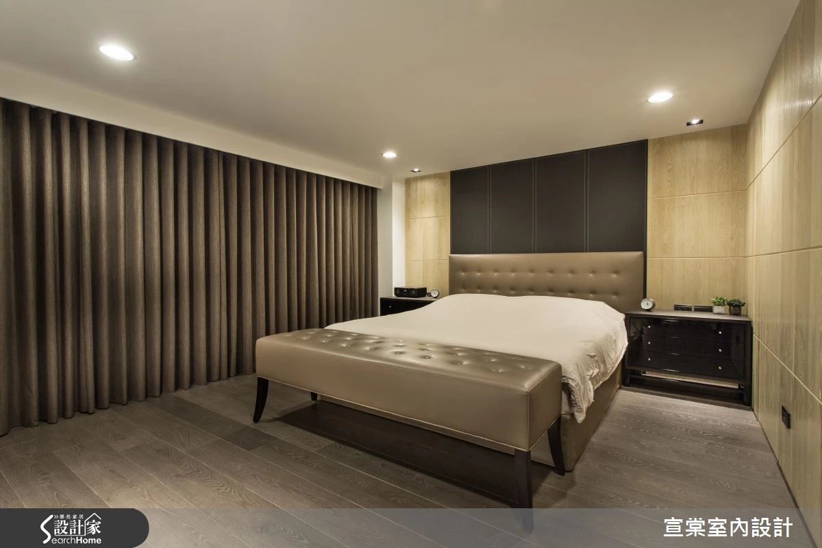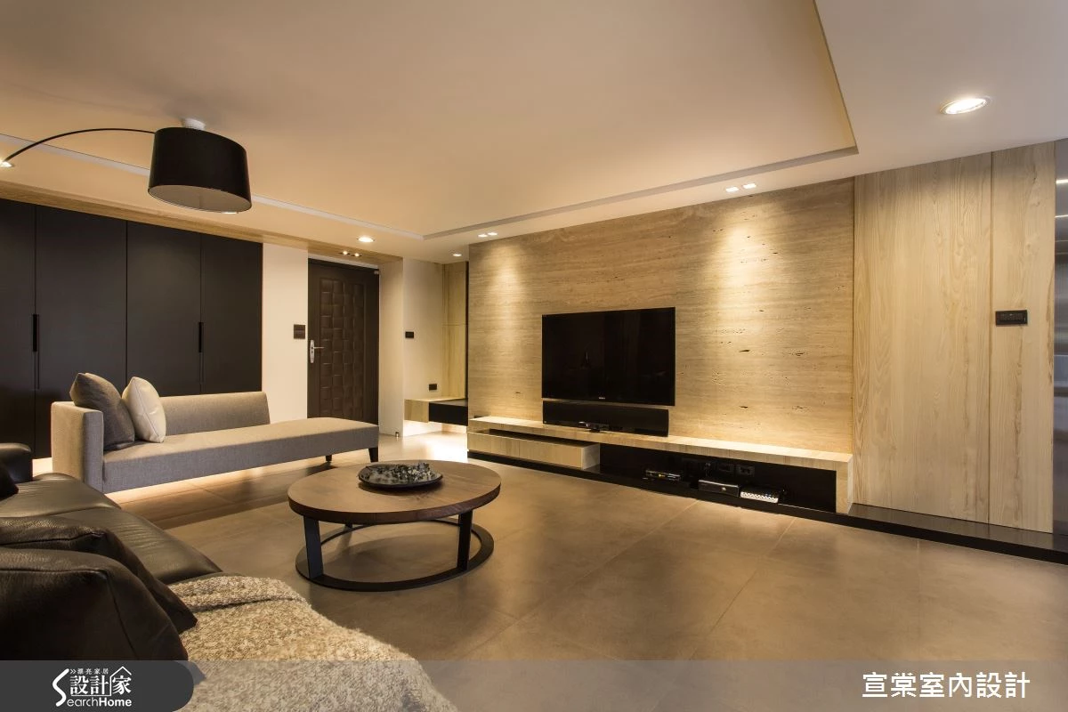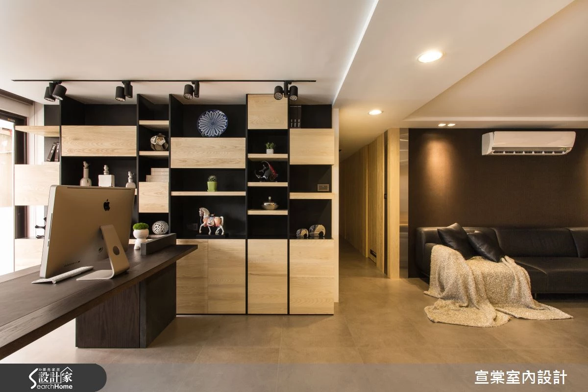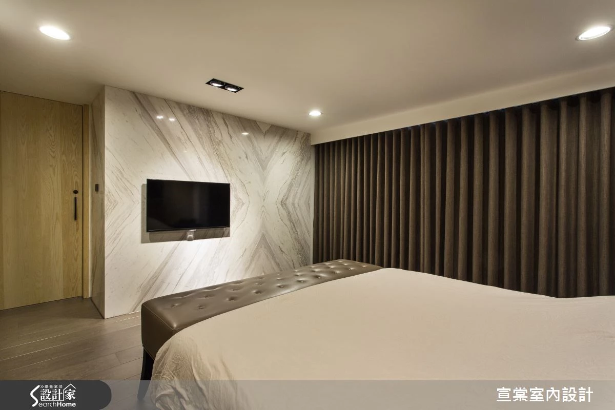 公領域內,規劃大面積淺色洞石電視牆,拓大空間視覺尺度,讓石材與木皮原始色彩無違和接軌,同時對應黑色立面、家具妝點,將穩重與溫潤予以揉合,創造平衡的視覺觀感,書房則納入公領域一部分,藉由窗外導入的自然光線,替長型格局注入恰到好處的自然氛圍,一旁書櫃在底牆穿插黑底色調,結合投射燈映照,與木質拼湊出多變的櫃體表情,而另一塊採光美好的場域則留給餐廳,並在餐廳、廚房之間配置玻璃拉門,創造互動良好的生活情境;主臥則挹注寬敞的活動領域、具氣度的穩重用色,透過家具點綴香檳色調,帶出些許時尚氣息,尤其大理石電視牆更刻意呈現偏向一側的 X 形對花紋路,讓空間表情更顯生動!