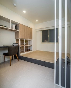 接續設計腳步,小孩臥室同樣以無印風的淺色風格,並去除櫃體的隔板,打造猶如鋼樑工地質感的室內角落;而休憩區域則改以和室地板呈現,使家中孩童無論是活動玩耍,或是夜晚睡眠,都能擁有安心合適的居所。機能齊全的烹飪空間,也讓屋主能在樸實簡單的慢活步調中,燒出一道道暖胃的好菜。