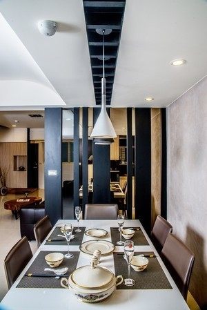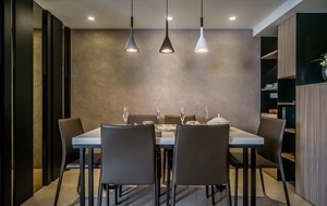 然而一轉進餐廳,優雅出眾的室內格調,又不禁對屋主的藝術品味大感讚嘆。同樣以簡約的黑白淺色混搭為視覺主調,輔以工業風的吊燈點綴,讓公寓大樓的室內空間中,呈現出中西齊鳴的特殊景象。