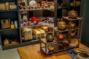 而後方的格狀櫃體,也擺放了款式多變的西式茶具,突顯屋主愛茶的興趣喜好。