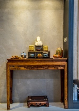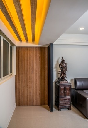 走進開放式的公共場域,曄穎設計團隊以電視牆延伸出的展示櫃體,界定玄關與客廳的分野;轉頭望向對面,則可見隱藏式門板旁邊,就佇立著莊嚴威武的菩提達摩「一葦渡江」銅像,也揭示了屋主對於禪宗的虔誠信仰。
