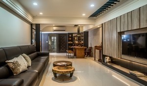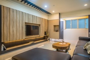 客廳部分,設計師運用了大量的直線線條,刻畫出俐落整齊的視覺感受,並以原木矮桌取代一般桌子;而天花板和電視牆則結合格柵的日式建築概念,讓整體裝潢更富層次。牆板下透過調性相近的媒材搭配,以內藏嵌燈的展示空間,除了擺脫以往電視牆櫃的既定巢臼外,也展現出破舊立新的設計風貌。