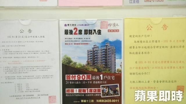 北屯大樓案「櫻花見森」廣告進攻附近中古大樓電梯布告欄。洪子恩攝