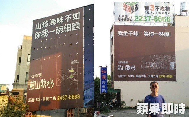如北屯大樓案「若山牧水」,廣告標語不投直球,改投變化球,出現像「竹杖茫鞋 輕勝馬」、「我坐千峰 等你一杯癮」等標語,耐人尋味。專案協理鄭弘昆指出,本案有6種不同的看板型態,中心思想都是暗指退休族離塵不離城的生活,「住在城市內,心也可以很慢。」