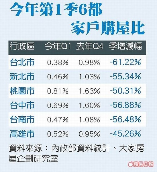 大家房屋統計6都家戶購屋比,發現台北季減幅逾6成最多,高雄減幅45.26%較低。6都第1季家戶購屋比皆不及1%,大幅衰退4~6成,台中連續2季表現相對較佳,季減幅卻也排第2。