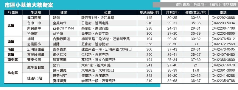 其中尤以西區、西屯小基地案推案最密集,如柳川旁預售新案「合勤綠園道」為市場最小基地大樓案,基地面積僅104坪,以當地少見的純2房產品切入市場,主力總價880~990萬元,塔式車位設計也是台中市場首見。文心捷運G5站旁近期出現新案「境美MRT」、「寶樺境雙」,2案同屬靜巷宅,因捷運利多加持,單價破3字頭,是捷運旁少見小基地新案。