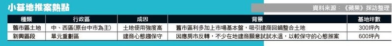 房市景氣差,成本較低的小基地,成為建商且戰且走的推案策略。其中舊市區的商業土地容積率高達280%,早期多僅興建透天,未完全發揮商業效益,加上土地市價比新重劃區便宜,受在地建商青睞,舊西區、中區土地因鐵路高架化活絡房市,是近2年建商卡位新熱區。
