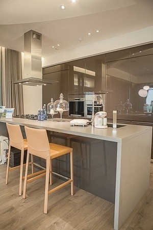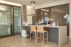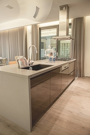轉到開放式的餐廚空間,明亮几淨的廚具則使用烤漆板材,營造優雅大方的質感;中島部分也和瓦斯爐及洗滌區結合,使家中女屋主在烹飪之餘,仍能保有充裕的活動動線;而擺設的兩張高椅,則可讓中島變身成吧檯,並成為交流家人情感的最佳場域。