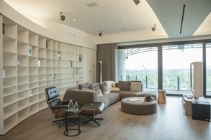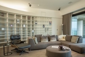 以素雅寧靜的『極簡』美學著名的設計,對家具挑選的質感也是極其講究。設計師陸希傑將L型的米色沙發擺設和黑色躺椅,恰好和展示櫃及天花板的弧型曲線達到完美的搭配;而圓弧型的桌子、配件,則調和了生硬的氛圍,並凸顯幾何形體的時尚美學。