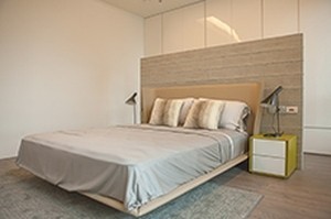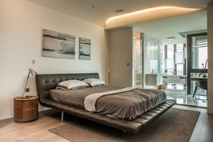 延續相同設計格調的主臥,在家具選用上也是頗富巧思。以木質地板搭配挑高的曲線床組,並延伸至床頭,為整體空間達到畫龍點睛的奇效;兩旁則加上鐵件擺飾及畫作點綴,讓深邃幽玄的詩意縈繞於臥室。