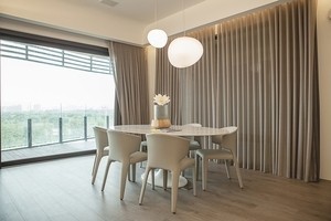 小巧精緻的餐廳,同樣保留了寬廣的視野及空間,透過挑高天花板、餐桌椅、幾何吊燈的搭配,將簡約舒壓的氛圍再度發散,並蔓延至每個室內角落;而這樣的大宅設計,也將大坪數的居家美學重新定義,回歸溫暖心靈的感性空間。