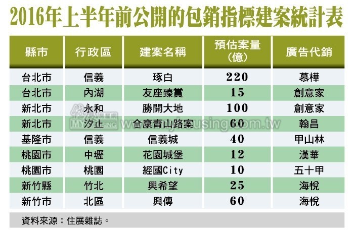 據住展雜誌統計,預計在今年上半年公開的包銷大案共有九件,分別由七大代銷接下,案量飆破五百億以上。似乎意味著代銷業者仍不看淡後市,願意承擔高風險來作包銷,積極搶抓房市第一波春燕。