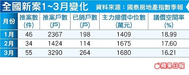 Q1全台量縮價跌就推案量來看,4月預售推案量約700億元,光是台北市信義區「琢白」、新北市林口區「森聯摩天41」案,總案量達400億元,佔4月總推案量近6成。