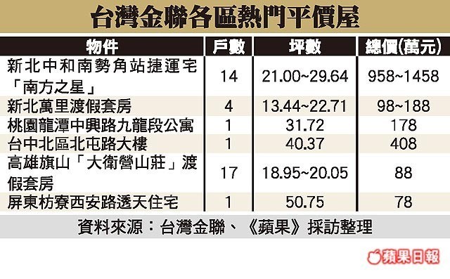 台灣金聯連6年推出平價屋專案,歷年標脫率7~8成,今年剔除土壤高度液化區物件,保證無海砂屋、輻射屋、凶宅,推出平價住宅50戶、商辦21戶、土地5筆,總共76件。
