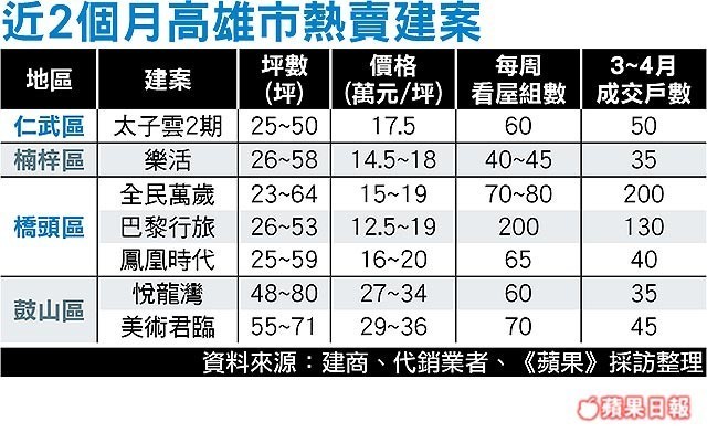 高市代銷建案量最大的上揚國際,銷售中的高雄新市鎮「全民萬歲」也開出每月成交百戶紅盤,處長朱建雄指出,每周看屋人數至少70組,因基地正對捷運青埔站且開價合理,近期舉辦社區活動炒熱人氣,進而帶動買氣。