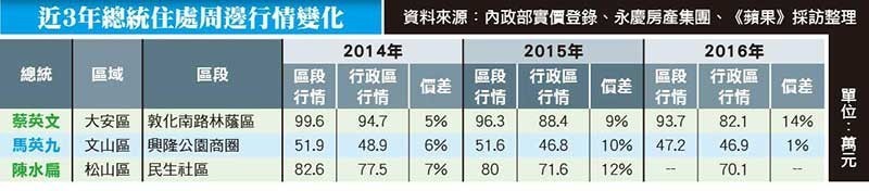 有巢氏房屋根據實價登錄資料,發現2014年至2016年,住在敦化南路的新總統蔡英文,住家附近這2年行情下跌6%,但今年行情仍超出區域均價14%;而住在文山區興隆公園旁的現任總統馬英九,住家近2年行情則跌9%,今年均價較區域高1%。