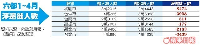 內政部最新數據顯示,雙北今年1~4月人口皆減少,北市減少3439人,新北市則減少2183人,尤其新北市總遷出人口突破5萬人,六都中以桃園、台中人口正成長最多,桃園市共增8472人,其次,台中市也正成長3908人,為表現最好的都會區,而南部人口則微幅增減,台南市微成長511人、高雄市略減177人。